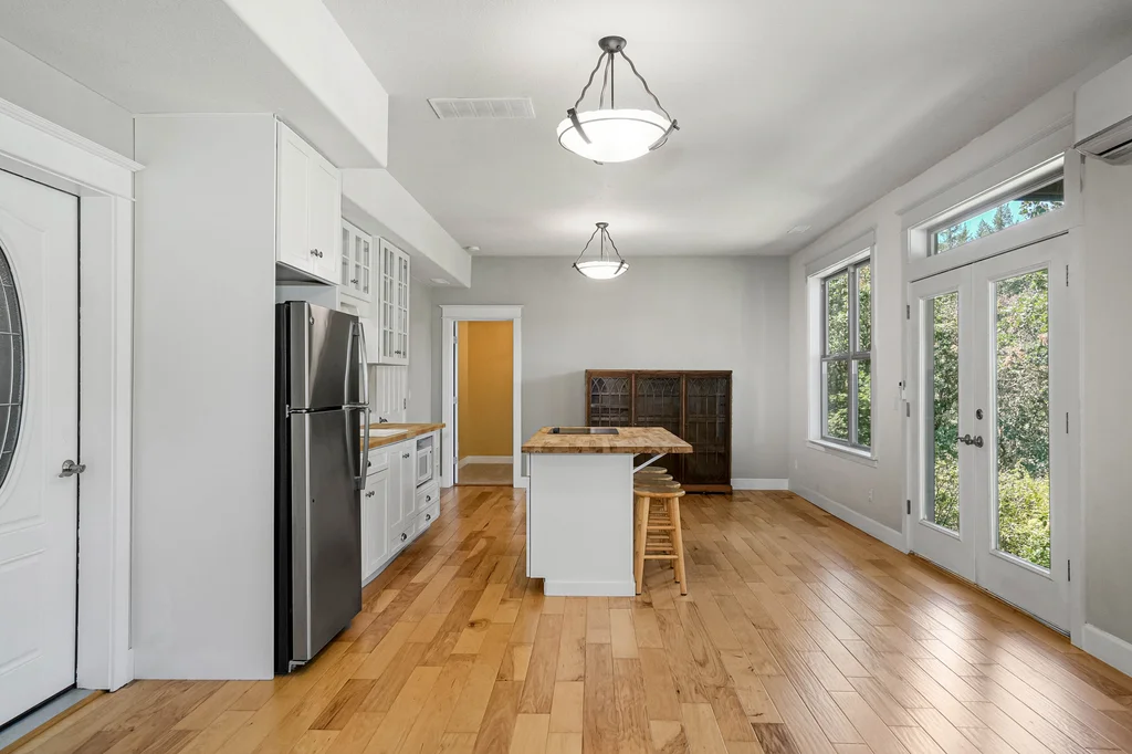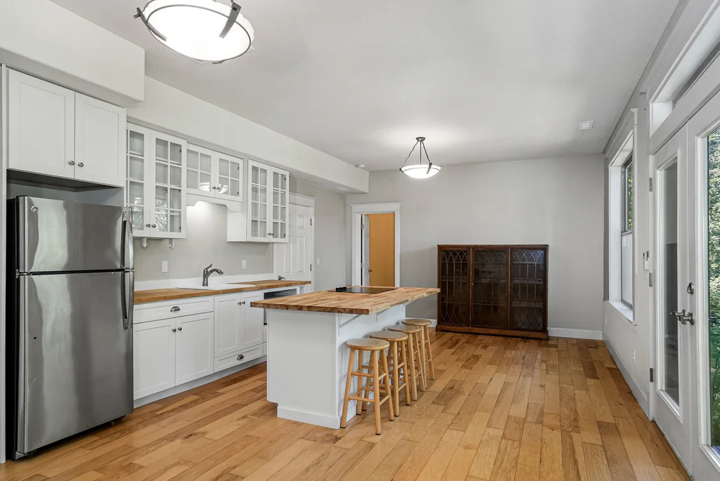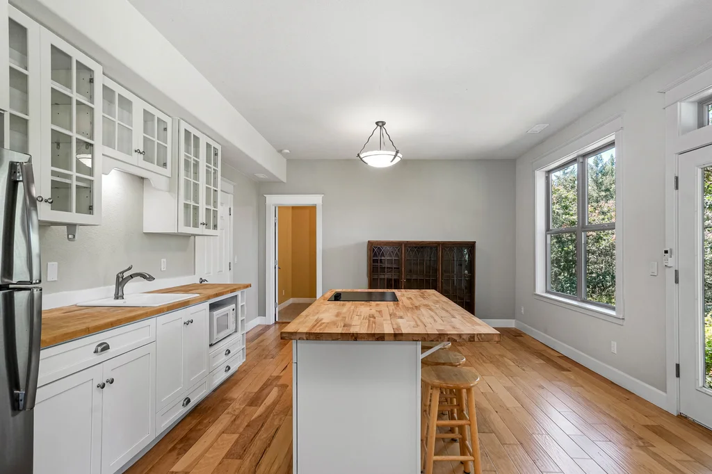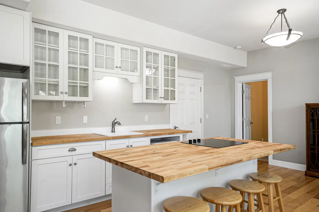 •	Kitchenette with wood butcherblock countertops,  white painted cabinets, volumes of storage